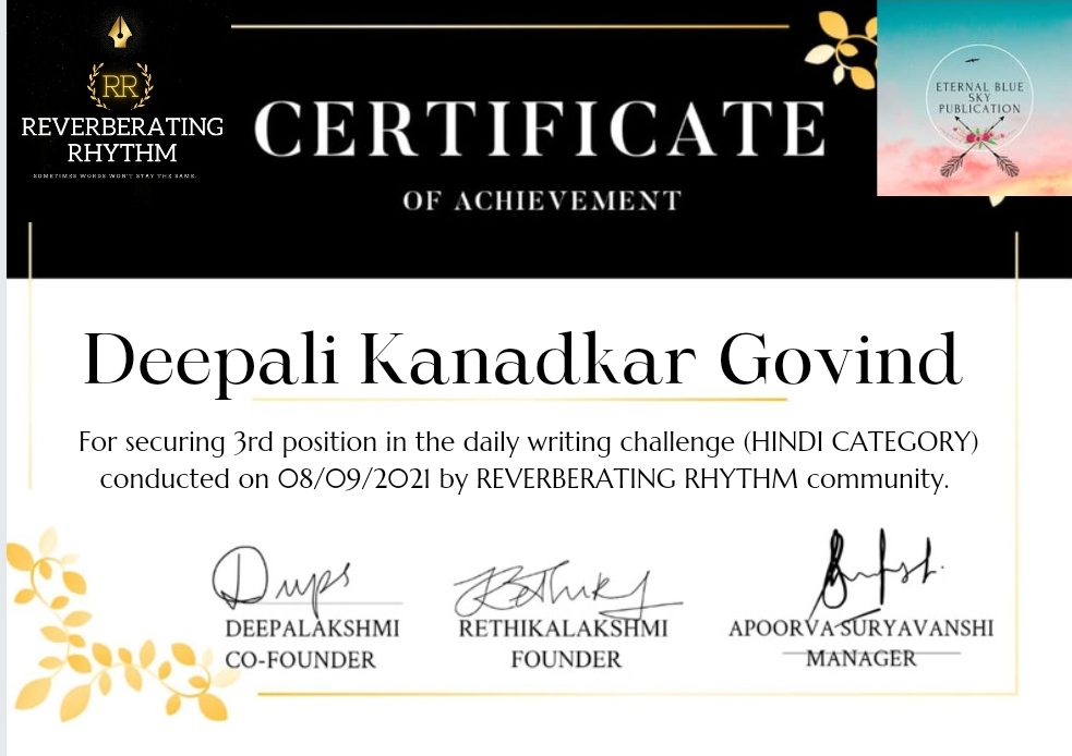 3rd Place by Deepali Kanadkar Govind | Posted on September 11, 2021September 16, 2021 Email Facebook WhatsApp Twitter LinkedIn Pinterest I am glad to receive 3rd place for my Poem “Hindu” https://www.deepalidreamz.com/hindu/ How useful was this post? Click on a star to rate it! Submit Rating Average rating / 5. Vote count: No votes so far! Be the first to rate this post. Views: 2,425