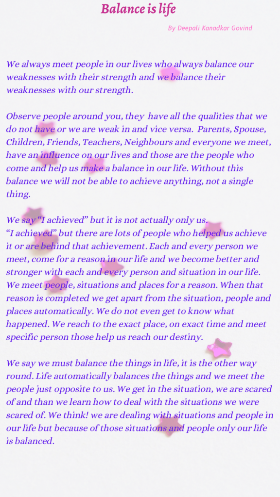 Balance is life by Deepali Kanadkar Govind | Posted on February 25, 2021 Email Facebook WhatsApp Twitter LinkedIn Pinterest How useful was this post? Click on a star to rate it! Submit Rating Average rating / 5. Vote count: No votes so far! Be the first to rate this post. Views: 4,129