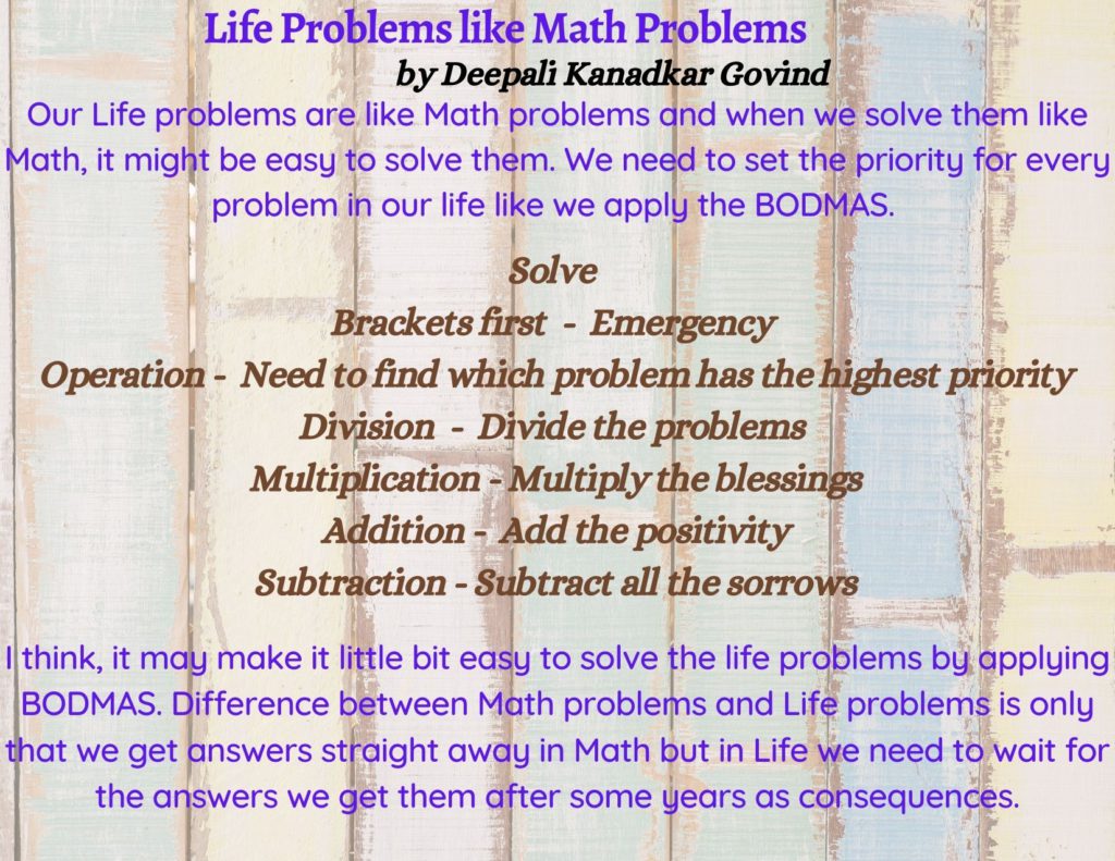 Life Problems like Math Problems by Deepali Kanadkar Govind | Posted on February 1, 2021June 10, 2021 Email Facebook WhatsApp Twitter LinkedIn Pinterest How useful was this post? Click on a star to rate it! Submit Rating Average rating / 5. Vote count: No votes so far! Be the first to rate this post. Views: 7,115