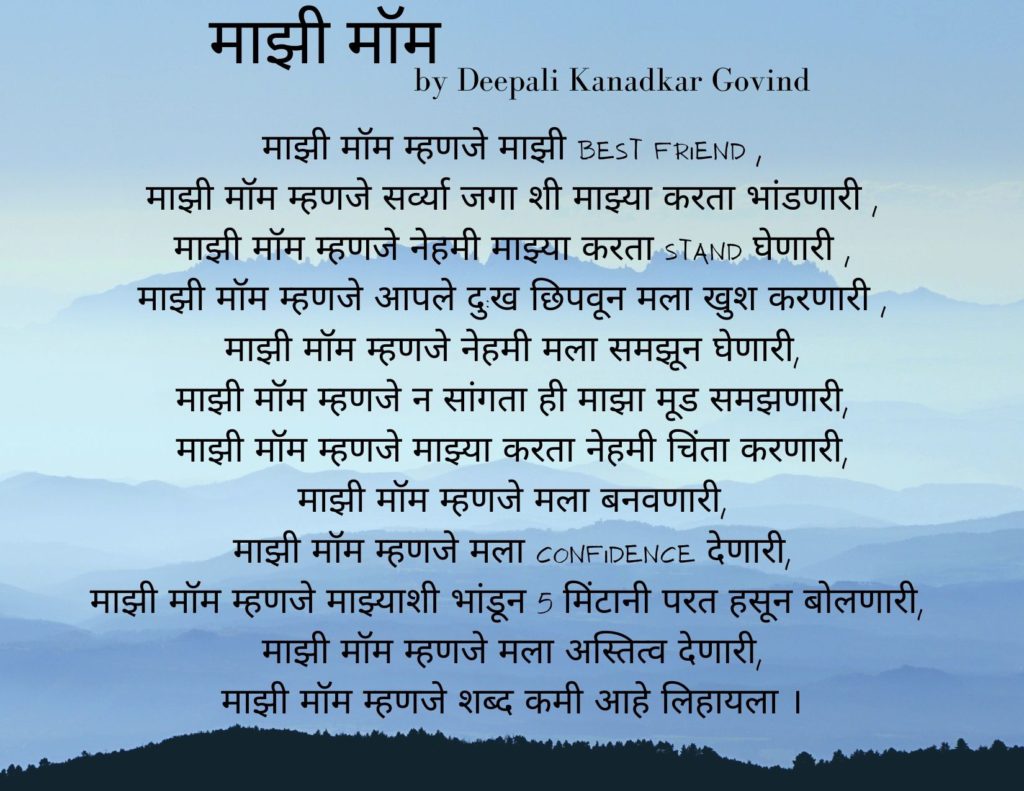 माझी मॉम by Deepali Kanadkar Govind | Posted on May 20, 2021September 11, 2021 Email Facebook WhatsApp Twitter LinkedIn Pinterest How useful was this post? Click on a star to rate it! Submit Rating Average rating / 5. Vote count: No votes so far! Be the first to rate this post. Views: 4,713
